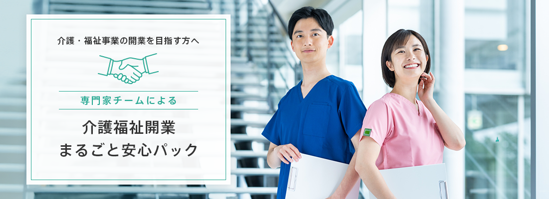 そこで、ミネルバ税理士法人、プライマリ行政書士法人・プライマリ社会保険労務士法人、Fukushi Vision Group株式会社の3社がチームを組み、介護・福祉業界で開業を目指す皆様を全面的にサポートする「介護福祉開業まるごと安心パック」を作成しました。初めての開業でも安心してスタートできるようにサポートします。